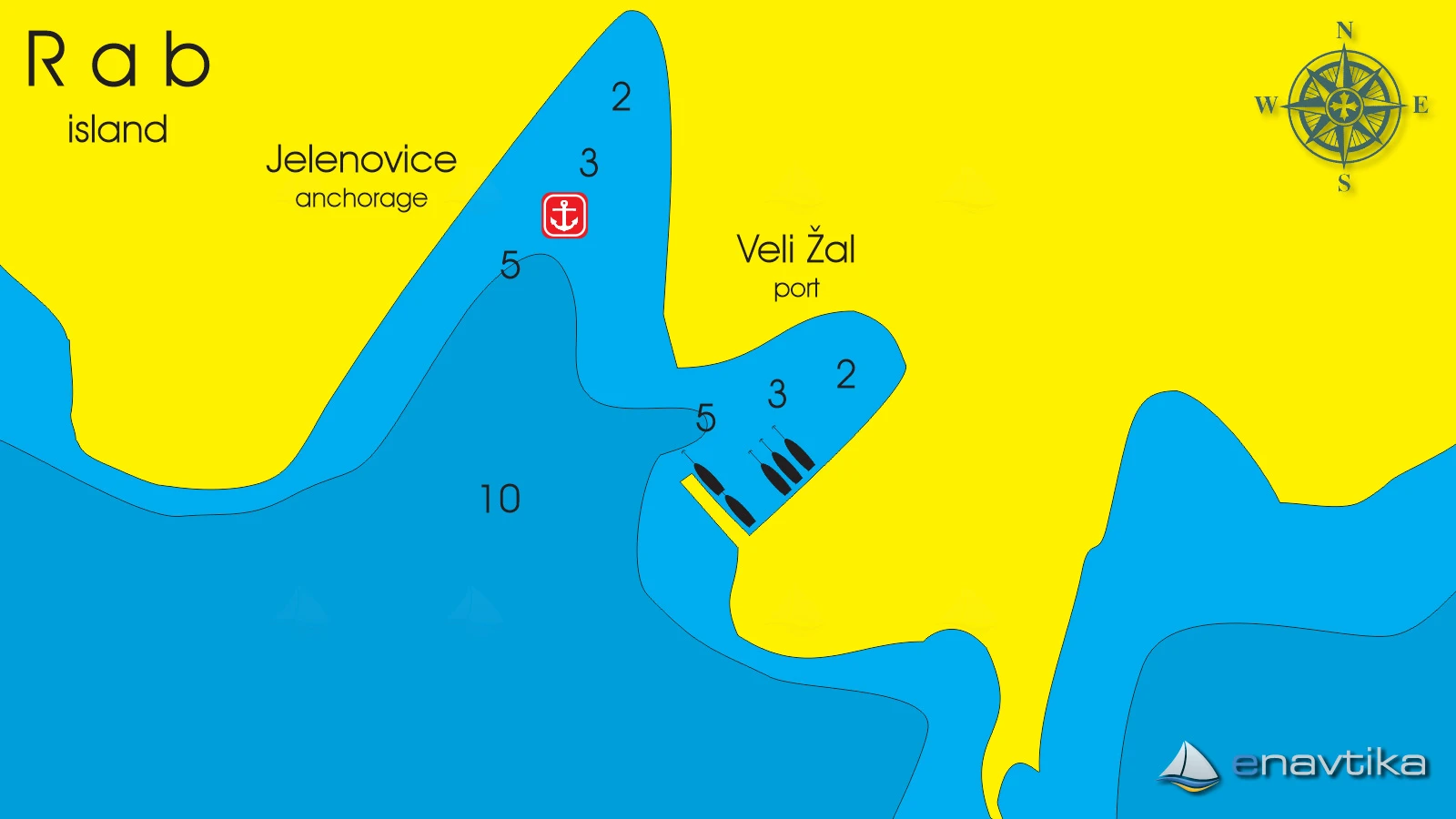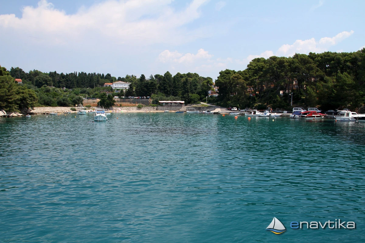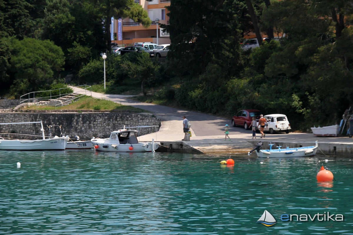 Veli Žal Harbour is located 2 nm west of the Rab town harbour. The small harbour has a pier to which two vessels can be moored sideways, and several more can also be moored to moorings that are moored to the shore. Most of the time, the moorings are occupied by local vessels or by vessels of tourists who live in nearby apartments. Anchoring is possible in front of the harbour or in Jelenovica Bay, northwest of the pier, which is protected from all winds except southerly ones.