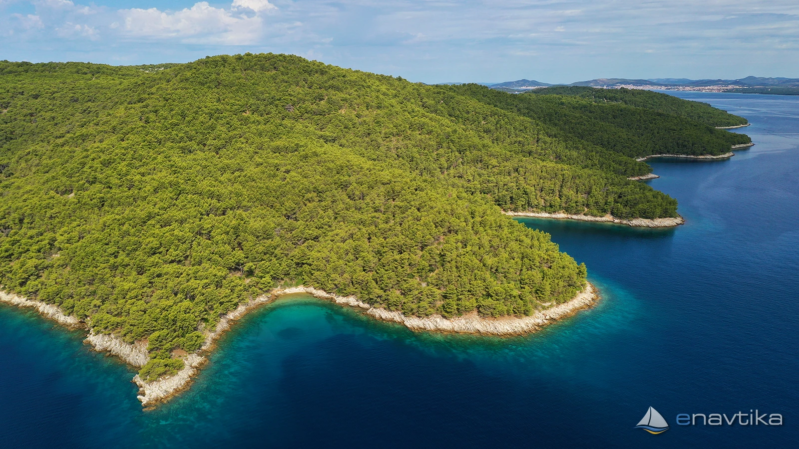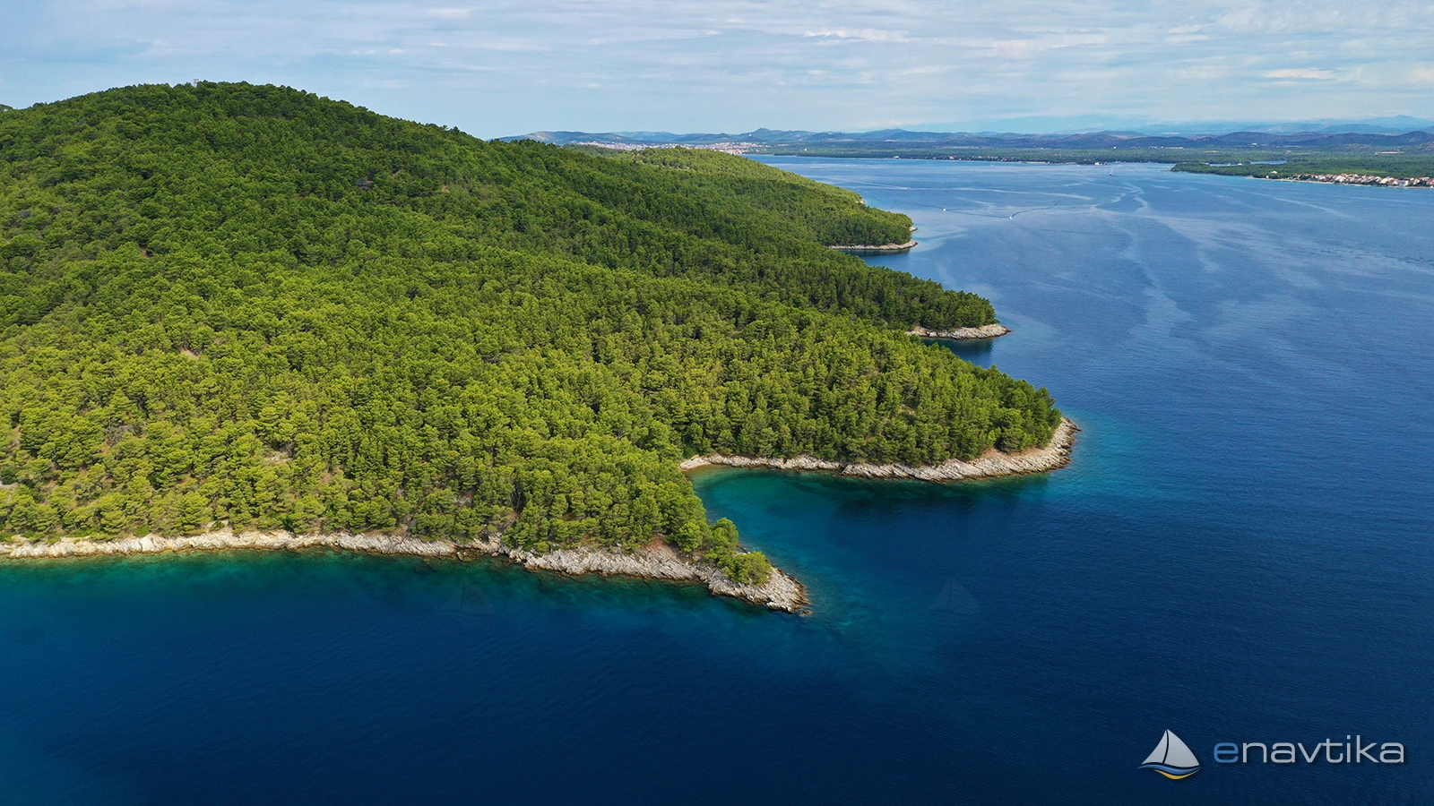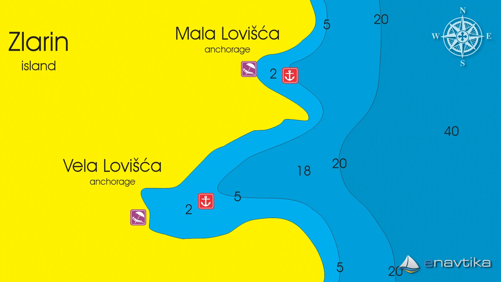 The anchorage Mala Lovišča is on the eastern side of the island of Zlarin. The bay is well protected from the westerly winds, the Burja and the Sirocco cause waves. We can anchor at depths between 2 and 15m. The bottom is sandy and the anchor holds well. The depths increase quickly. There is a small sandy beach in the bay. The nearest tavern is on the mainland in Brodarica or in the port of Zlarin on the northern side of the island. The nearest gas station is in the town of Šibenik or in front of the Vodice marina. Both are about 5 nmi by sea.