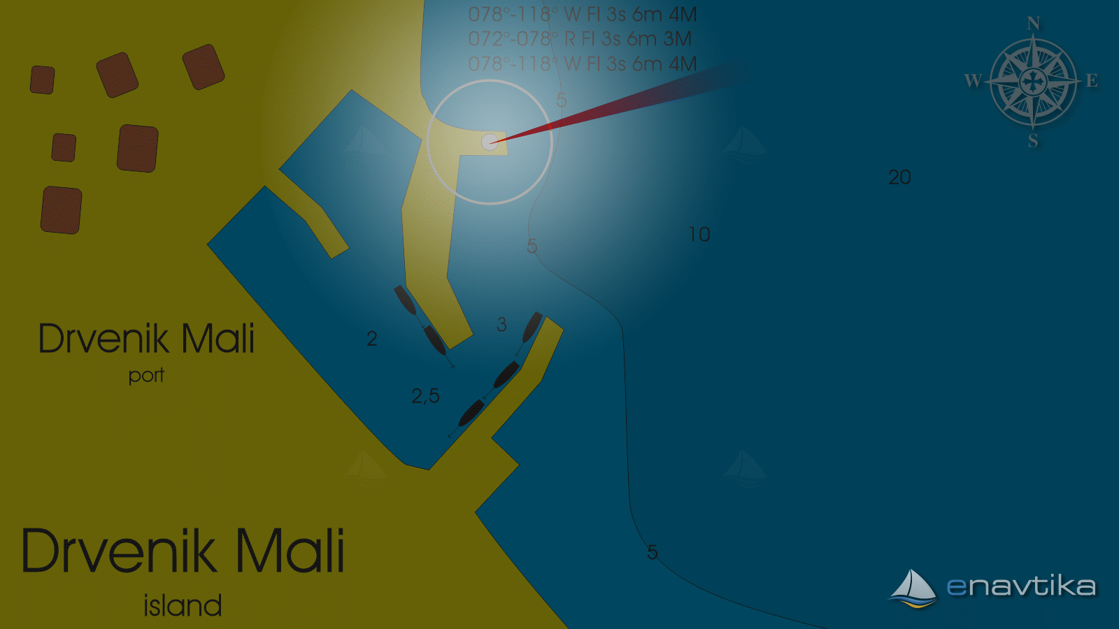 | Caratteristiche | W28°-252°, R252°-258°, W258°-298° Fl 3s 6m 4M |