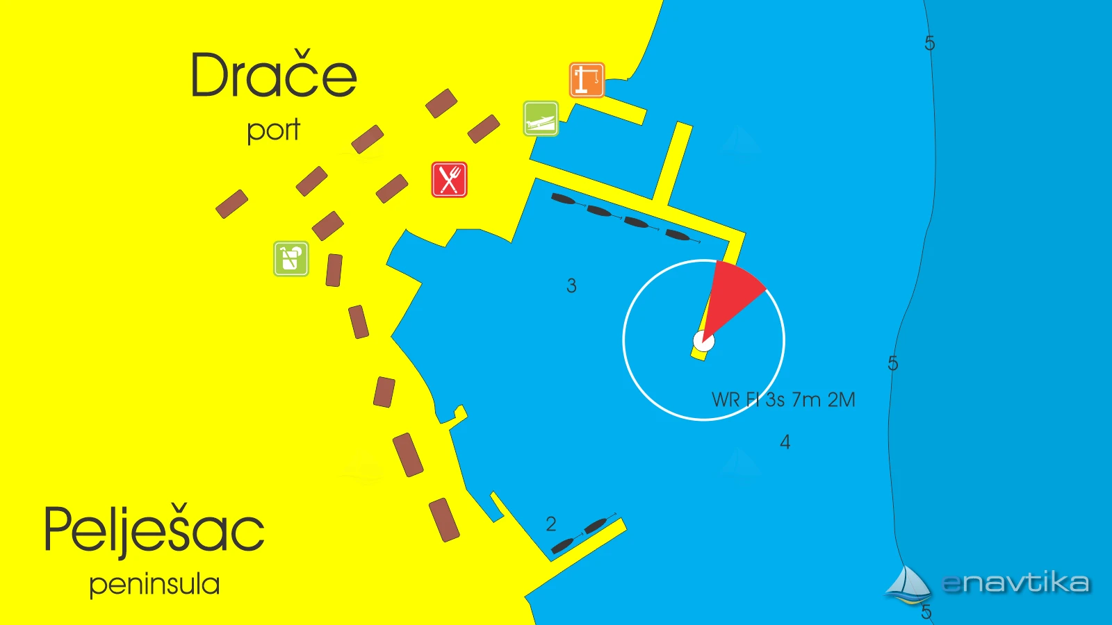 Luka Drače je na severovzhodni strani polotoka Pelješac. Zaščitena je pred zahodnimi in severnimi vetrovi. Burja in močan jugo povzročata valovanje. V luki se lahko privežejo manjša plovila, saj je največja globina vode le 3 metre. Plovilo je možno privezati na jugovzhodni in severovzhodni valobran. Pri plutju v luko moramo biti pozorni na čeri in plitvine, ki se nahajajo vzhodno od rta Rat in v okolici otočka Goljak. Plitvina Bililo je označena s črno-rumeno bojo. Pri plutju k luki ne smemo pluti v rdečem koridorju svetilnika, ki se nahaja na glavi severovzhodnega valobrana. V luki so drča za splovitev plovil, restavracija in bar. Najbližja bencinska črpalka je v Pločah, do koder je 9 nmi plovbe.