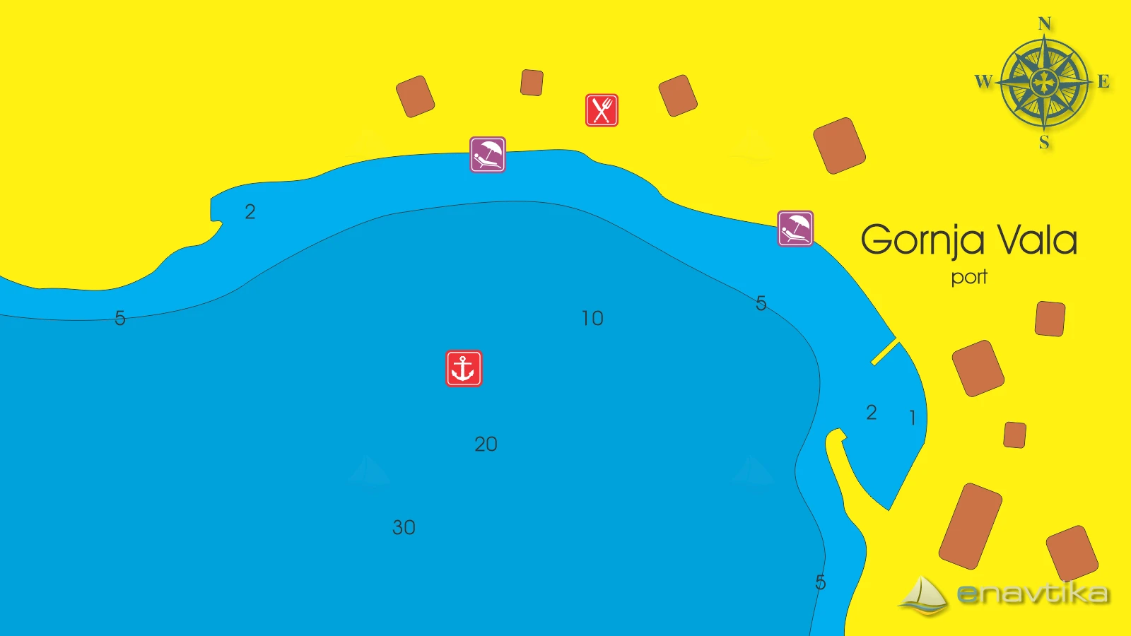 Majhna luka Gornja Vala je v neposredni bližini trajektne luke Drvenik, ki povezuje otok Hvar s kopnim. Luka je v celoti namenjena komunalnemu privezu. S plovilom lahko pristanemo bočno le na severnem pomolu. Globine morja v luki so med 2 in 6 m. Pred luko lahko sidramo. Globine morja so med 2 in 20 m. Dno je peščeno in sidro dobro drži. V luki je več gostil in trgovina. Najbližja bencinska črpalka je v luki Ploče, ki je oddaljena 9 nmi.