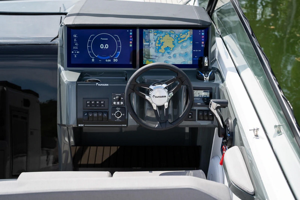 Vsa novejša plovila Yamarin serijsko opremijo s pametnim zaslonom Yamarin Q (10" ali 16"), ki v eni napravi združuje navigacijo, podatke o motorju (Yamaha), vremenske informacije, priročnike, posodobitve “over-the-air” ter povezavo z mobilno aplikacijo (elektronski dnevnik, sledenje, deljenje poti). Spomladanska nadgradnja 2025 prinaša osvežen vmesnik in prilagodljive gradnike. (Ponudnik elektronskih kart je odvisen od konfiguracije — podprti sta C-Map in Navionics.)