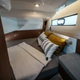 Sprednja lastniška kabina obljublja prijetne noči na morju. S posteljo velikosti 160x200, lakiranim pohištvom, ambientalno osvetlitvijo, oblazinjenim vzglavjem in prostorno omaro za obešanje oblačil nudi izjemno raven udobja in elegance, ki ju redko najdemo na čolnih te velikosti. Enako udobna kabina za goste sprejme dva potnika, salon pa se lahko preuredi v dodatni dve ležišči.