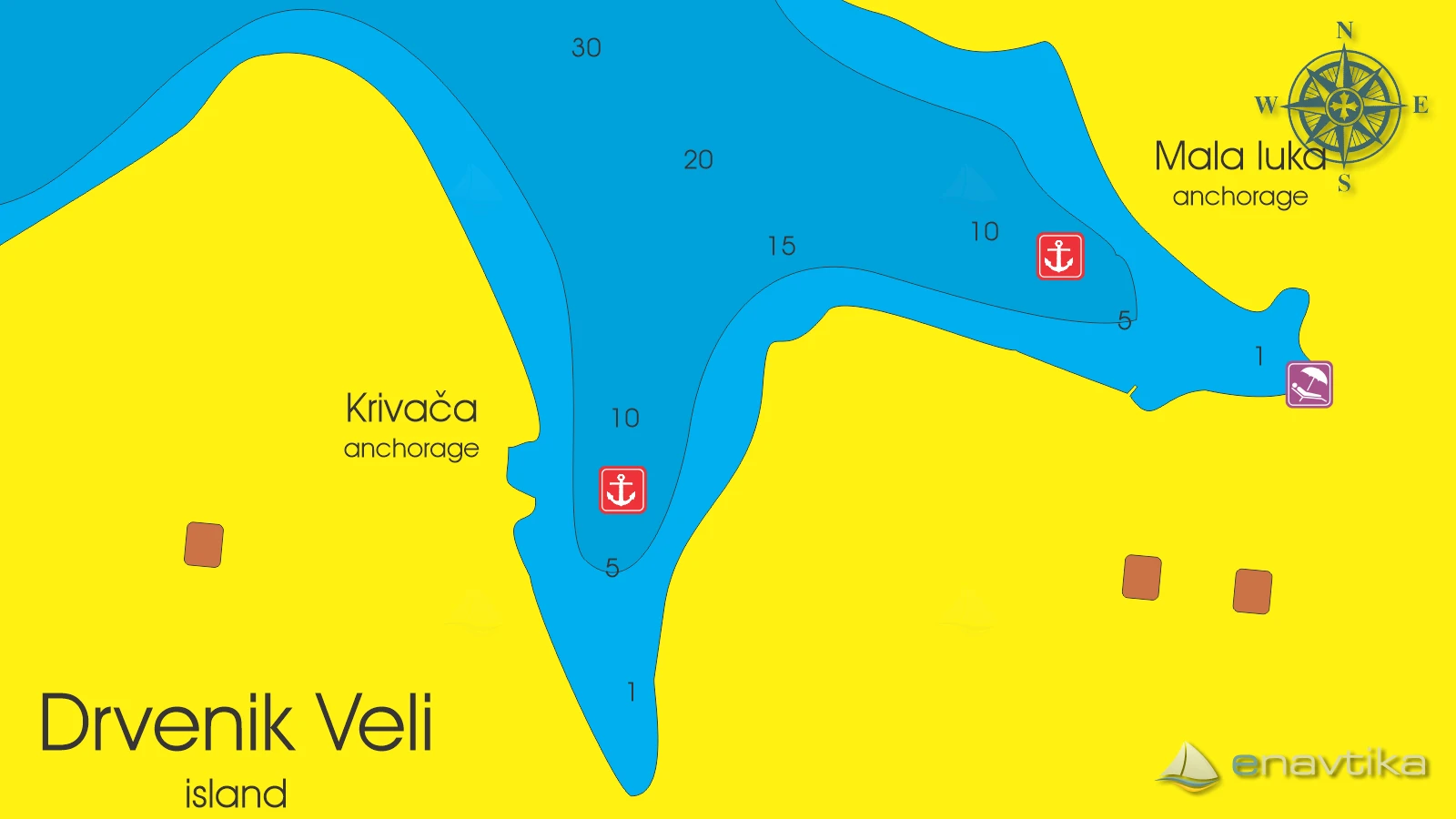 Sidrišče Krivača leži na zahodni strani otoka Drvenik Veli. Zaliv je dobro zaščiten pred vsemi vetrovi, razen iz severnih smeri. Globina morja je med 2 in 20 m. Dno v zalivu je peščeno, ponekod kamnito in ponekod poraščeno s travo. Pri sidranju moramo biti previdni, da je sidro dobro prijelo. V zalivu ni ponudbe. V luki Drvenik, ki je oddaljena le 1,5 nmi, so gostilne, trgovina in pekarna. Najbližja bencinska črpalka je v luki Rogač na otoku Šolta, do koder je 8 nmi plovbe. Za zaliv ni podeljena koncesija. Prenočevanja na sidru ni treba plačevati