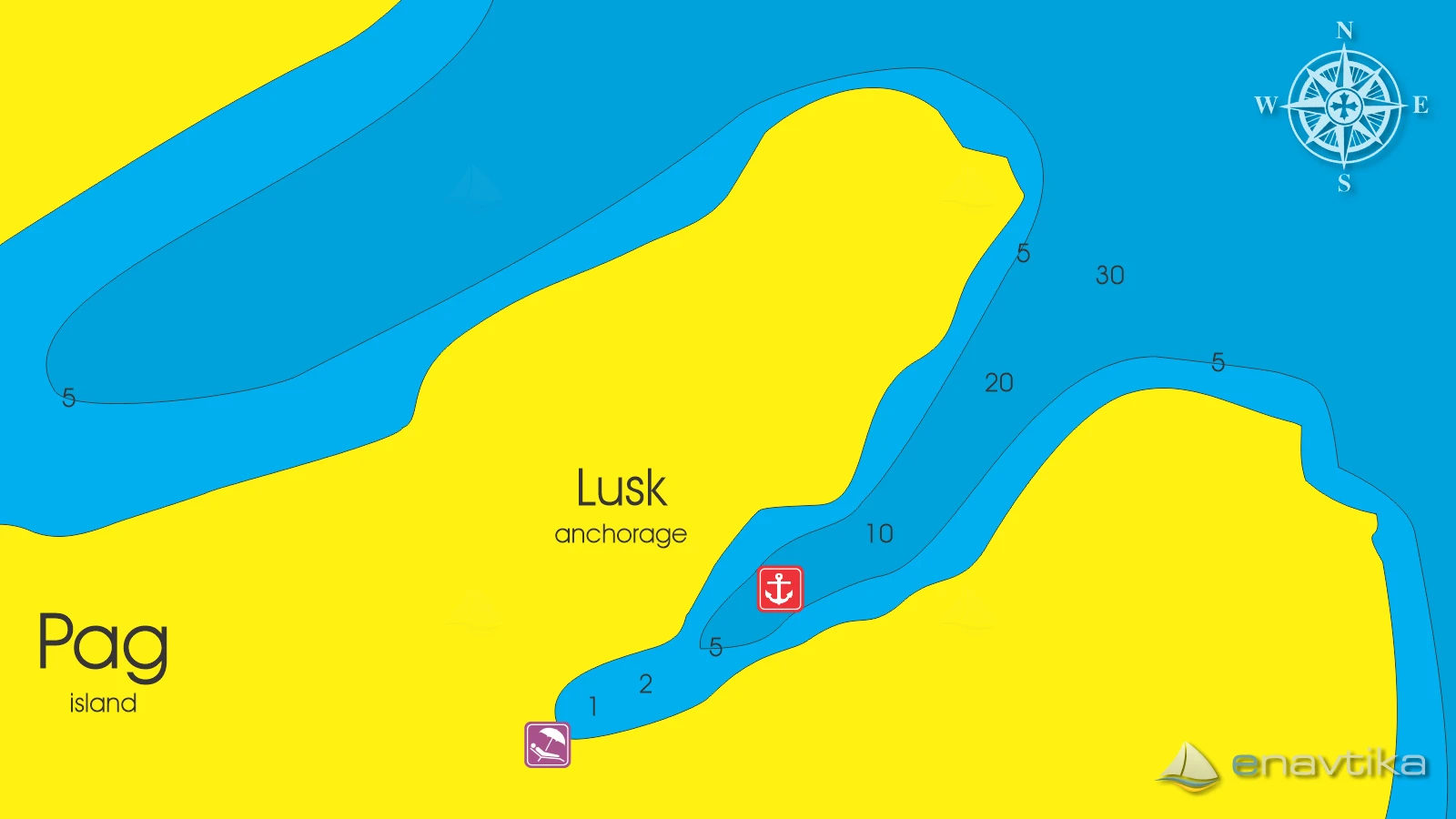Zaliv Lusk je na vzhodni strani otoka Pag. Obdajajo ga visoke pečine zato globina morja hitro narašča. Dno je peščeno v sredini zaliva in sidro dobro drži. Sidramo lahko na globinah med 2 in 20 m. Zaliv je zaščiten pred južnimi in zahodnimi vetrovi. V primeru napovedi močnejše burje moramo zaliv pravočasno zapustiti. V zalivu je peščena plaža. Najbližja gostilna je v kraju Stara Novalja, najbližja bencinska črpalka pa v mestu Rab na otoku Rab, ki je oddaljena 12 nmi. Za sidrišče ni podeljena koncesija. Sidranje na lastnem sidru je brezplačno.