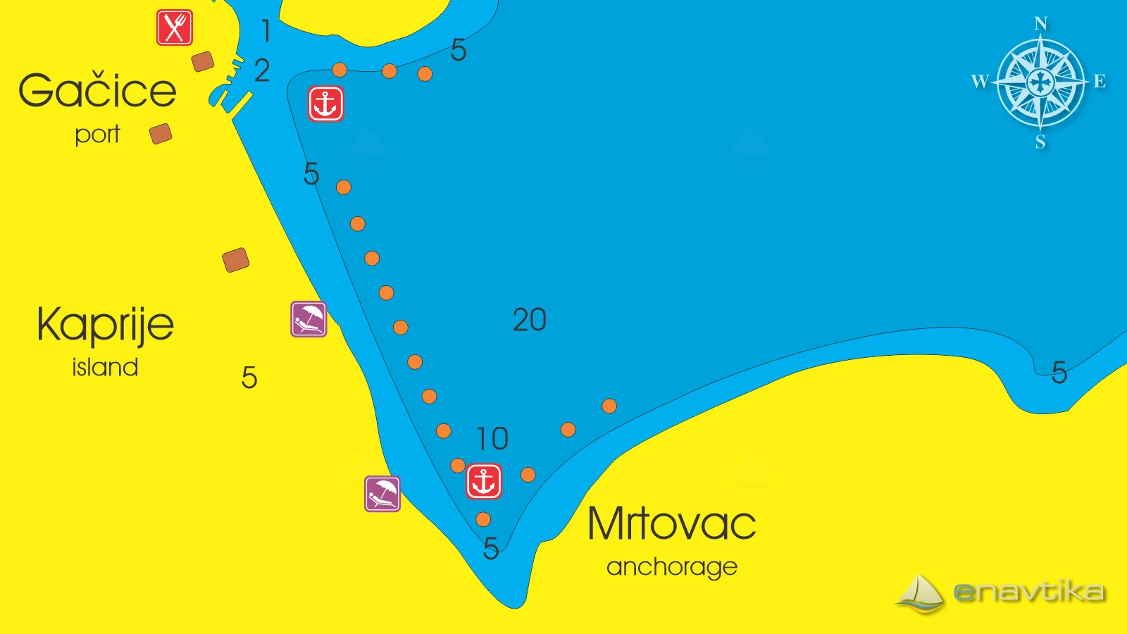 V zaliv lahko priplujemo iz severovzhodnih smeri. Plovba med otokom Kaprije in Oštrica ni možna. Globina mojra je le 0,5 m.