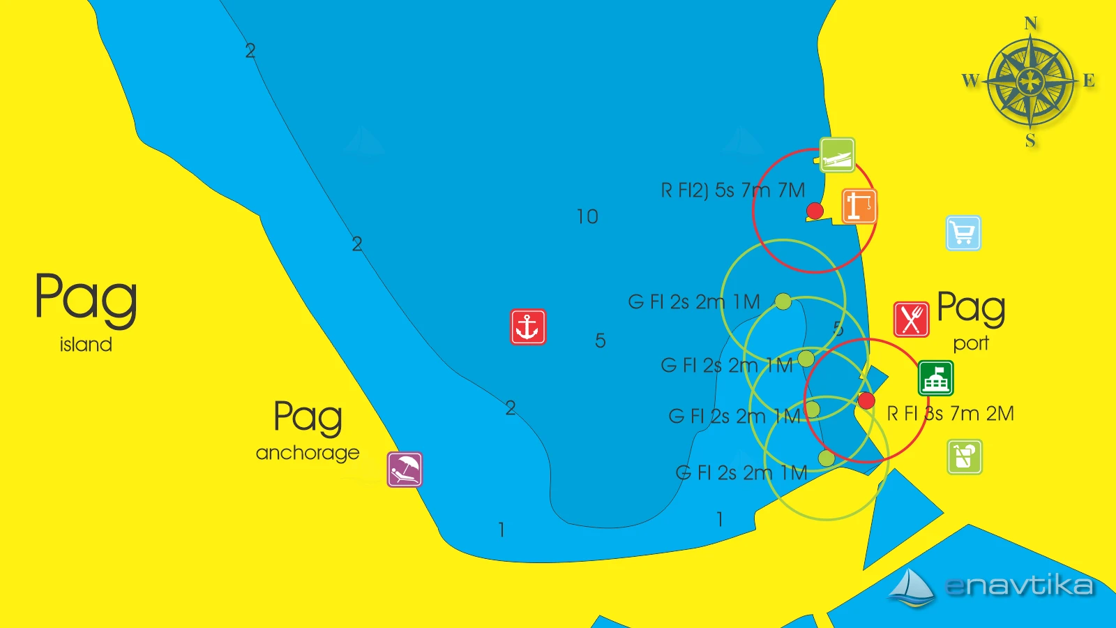 Sidrišče je zahodno od luke Pag. Globine morja so med 2 in 10 m. Dno je peščeno in sidro drži dobro. Pri vplutju v zaliv moramo biti pozorni na plitvino pred luko Pag, kjer je globina morja le med 0,5 in 1 m. Plitvina se razteza od 4 zelenih oznak proti zahodu. Zaliv je zaščiten pred južnimi vetrovi in delno zahodnimi. V luki so številne gostilne in trgovine. Najbližja bencinska črpalka je v mestu Rab na otoku Rab, do koder je 22 nmi plovbe. Za zaliv ni podeljena koncesija. Sidranja na lastnem sidru ni treba plačevati.