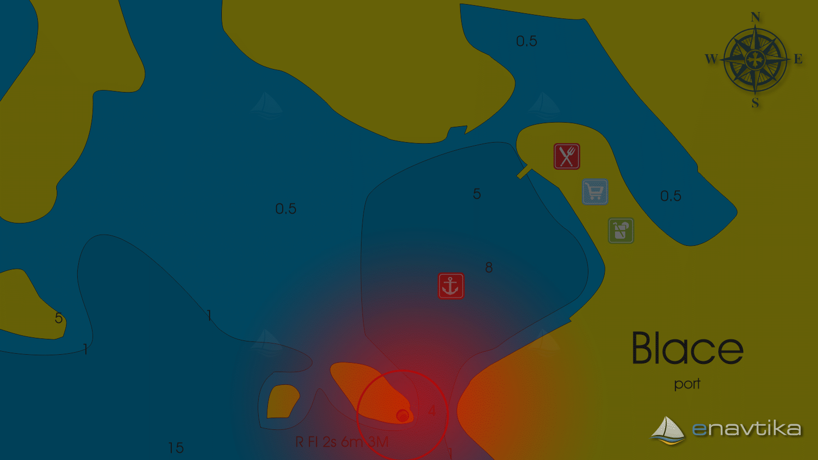 Svetilnik št. 671 stoji na majhnem otočku Veliki Školjič pred luko Blace v delti reke Neretve. Rdeča železna konstrukcija je visoka 4 m. Luč je na višini 6 m nad morsko gladino. Vsaki 2 s oddaja blisk rdeče svetlobe, ki je vidna z razdalje 3 nmi. V sektorju med 088° in 178° (90°) je svetloba zatemnjena. Karakteristika luči je R Bl 2s 6m 3M. Pri plovbi v luko moramo svetilnik pustiti na svoji levi strani.