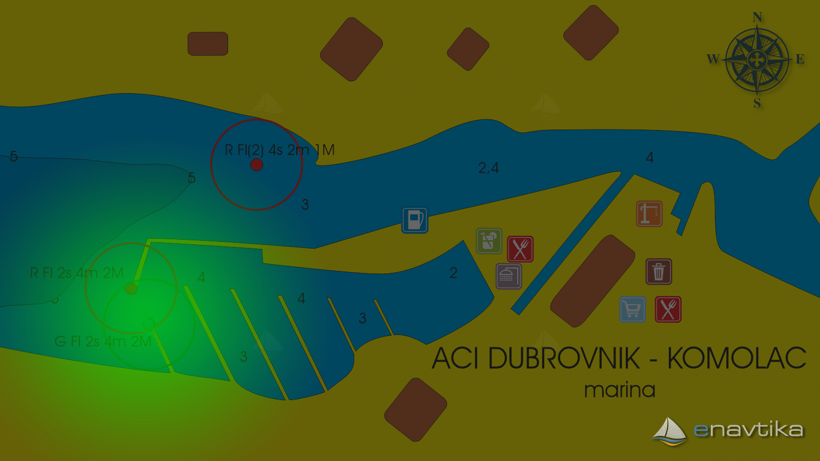 Svetilnik št. 269 stoji na južnem pomolu ACI marine Dubrovnik v kraju Komolac. Zelena železna konstrukcija je visoka 4 m. Luč je na višini 4 m nad morsko gladino. Vsaki dve sekundi oddaja blisk zelene svetlobe, ki je vidna z razdalje 2 nmi. Karakteristika luči je G Bl 2s 4m 2M.