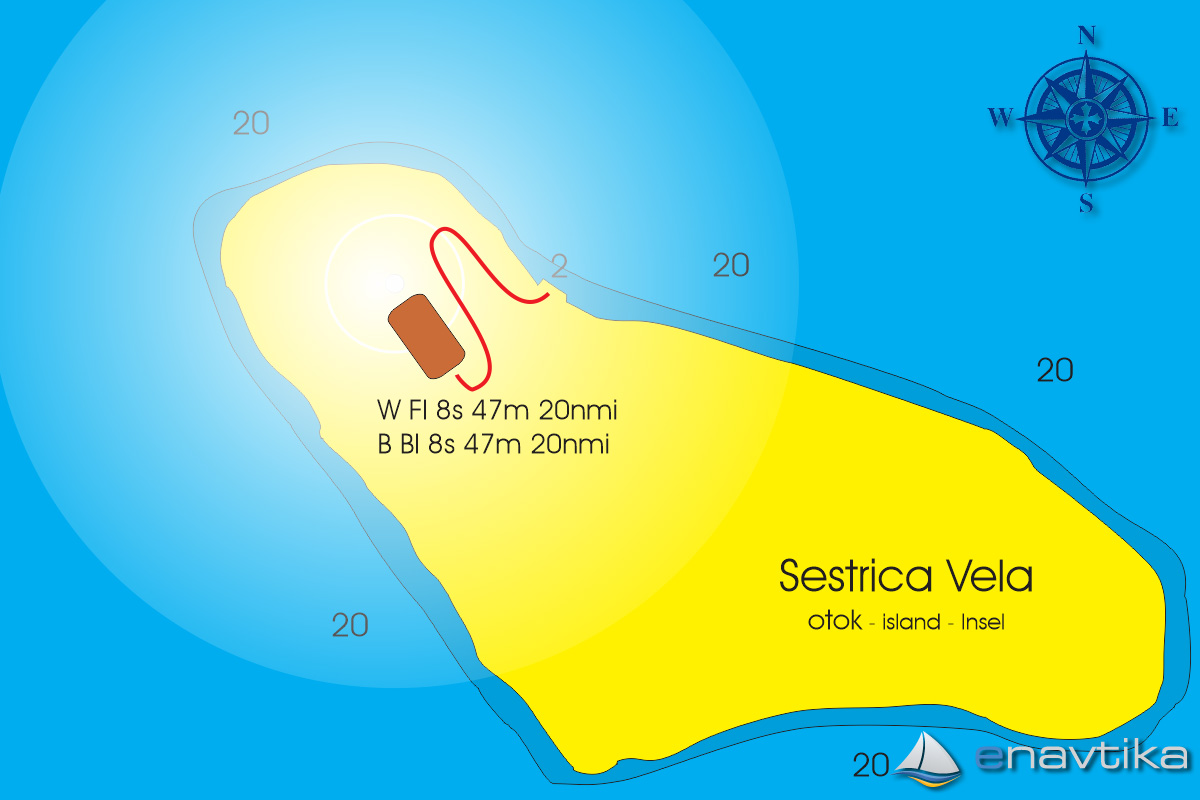 Svetilnik Sestrica Vela stoji na severozahodni strani istoimenskega otoka, ki je na skrajni severni strani Nacionalega parka Kornati. Svetilnik, ki ga domačini imenujejo tudi Tajer, so zgradili leta 1876 in še danes na njem prebiva svetilničarska posadka, ki skrbi za njegovo pravilno delovanje. Svetilnik stoji na strateški lokaciji, zanimiv pa je tudi zaradi svojevrstne gradnje. Luč svetilnika je na vrhu osemkotnega stolpa visokega 26 m, na skupni nadmorski višini 47m. Stolp je izdelan iz železnih plošč, ki so spojene z zakovicami. Vse do danes ni bilo potrebno zamenjati nobene. Poleg svetilnika je kamnita hiša namenjena svatilničarski posadki. Hišo in stolp povezuje edinstven kamniti pokrit most, ki so ga zgradili naknadno, da je imel svetilničar v slabem vremenu lažji dostop do svetilnika. Stolp svetilnika je obarvan v značilno kombinacijo rdeče in bele barve in ga hitro opazimo. Dostop do svetilnika je mogoč na severni strani otoka, kjer je kamnita utrjena obala. Svetilnik je kljub posadki, avtomatiziran in daljinsko nadziran. Danes so na svetilniku urejeni apartmaji v katerih je možno prenočiti. Karakteristika svetilnika je B Bl 8s 47m 20nmi. Belemu blisku dolgemu 1s sledi 7s premor. Luč svetilnika je na višini 47m nad morjem in je vidna 20 nmi daleč. Sveti v krogu 360° in ima pomožno luč, ki sveti v primeru okvare primarne luči in je vidna 12 nmi daleč. Oznaka svetilnika: 366 / E3134.