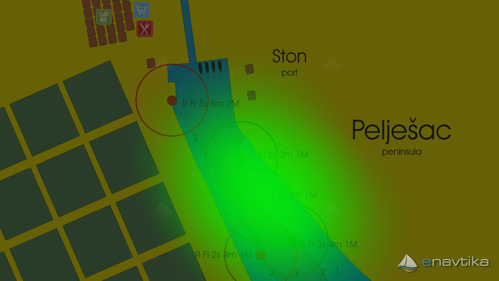 Svetleča oznaka št. 717.5 stoji na severni strani Stonskega kanala. Železna palica, ki ima na vrhu trikotnik, je nameščena na globini 3 m. Globina severno od oznake pade pod 1 m. Luč je na višini 2 m. Vsaki 2 sekundi oddaja blisk zelene svetlobe, ki je vidna z razdalje 1 nmi. Karakteristika svetilnika je Z Bl 2s 2m 1M. Pri plovbi proti luki Ston moramo oznako pustiti na svoji desni strani in pluti proti oznaki 717.6.