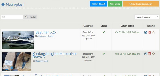 Vsi vaši oglasi so zbrani drug pod drugim. Navedeni so bistveni podatki oglasa, status oglasa (objavljen/ne objavljen), datum vnosa in tri ikone (Uredi oglas, Izbriši oglas in zvezdica – objavi kot TOP OGLAS). Posamezne oglase lahko naknadno spreminjate, ponovno objavljate, ko oglasi potečejo, izbrišete, ali jih dodatno izpostavite kot TOP OGLAS.